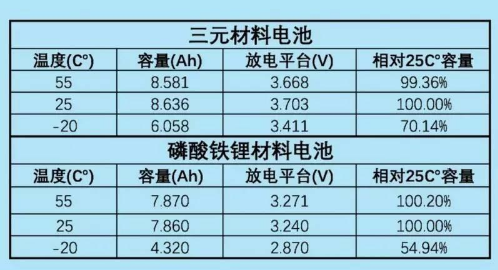 從上圖中能夠看出,以25℃為基準常溫,兩類電池在55℃高溫下放電與常溫25℃下放電,放電容量幾乎沒有差別。但在零下20℃時,三元鋰電池與磷酸鐵鋰電池相比有比較明顯的優勢。