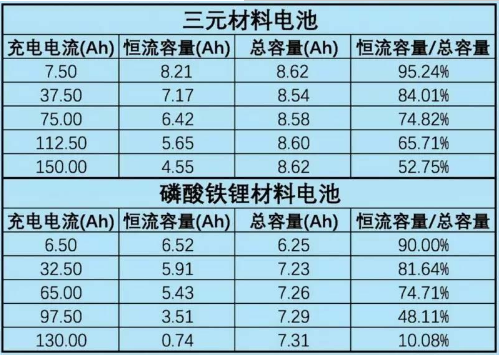 從表中可以看出,三元鋰電池與磷酸鐵鋰電池在10C以下充電時,恒流比無明顯差距,10C以上倍率充電時,磷酸鐵鋰電池恒流比例迅速降低,充電效率迅速降低。