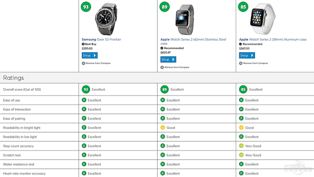 大家可以從上面的表格里看到這19款產品的前10款排名以及對應的得分,三星Gear S3的兩個版本分列前兩名,隨后是蘋果、LG、佳明等,而且有趣的是,前兩款三星Gear S3的價格(350美元,稅前)僅為第三名Apple Watch Series2(不銹鋼版)的一半(700美元,稅前),于是我們比較好奇該機構對這些產品的具體評分是怎樣的?