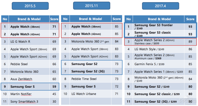 我們翻查了該機構近兩年智能手表類別的排名數據,發現蘋果Apple Watch之前一直占據著前兩名,從2015年開始的Apple Watch一代,到去年發布最新的Apple Watch Series2上,由于系統升級和硬件換代的因素,其蘋果Apple Watch手表的評分一直在增加,從71分、85分到這次的89分,不斷在進步,只是這次兩款三星Gear S3的得分均高達93分,所以說這不能怪蘋果(三星:怪我咯!)