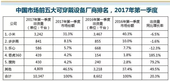 2017年第一季度,中國可穿戴設備市場排名中,兒童手表廠商奇虎360和搜狗旗下的糖貓科技憑借較高的性價比優勢,豐富的線上資源,以及持續的產品迭代,進入市場前五名。而前三名廠商的出貨量同比均有所下降。其中,小米在經過去年第四季度促銷的刺激后,其市場需求的熱度暫時退卻。步步高旗下的小天才雖然持續保持在兒童手表市場的龍頭地位,但產品定位高端且升級速度相對較慢,增長動力略顯不足。樂心在手環市場上面臨更加激烈的競爭,今年試圖通過整合線上渠道和加強品牌推廣投入的方式,進一步拓展市場。