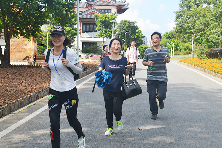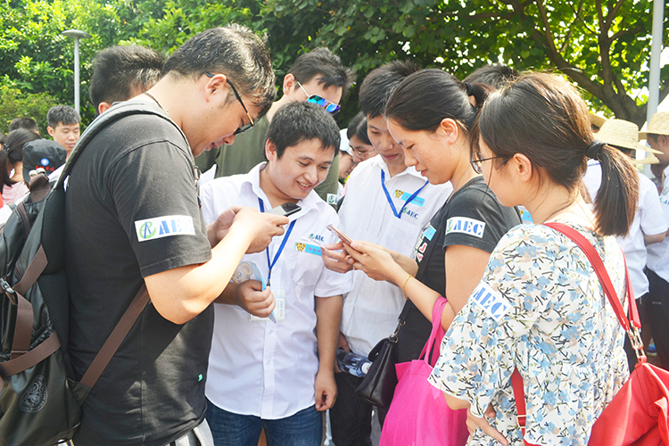 在完成知識問答之后,線索提示組員們需要尋找到活動會務組指定成員念出對接暗號,成功配對并完成指定任務贏取積分。各組成員為了迅速找到任務中指定的會務組成員,斗志立刻被點燃,在寬廣的花都湖風景區奔跑起來。每個人的衣服上都貼著印有公司標志“AEC”的袖章,仿佛瞬間在風景區里掛起一陣AEC旋風,此情此景何其壯觀。在尋人過程中各組成員斗速度斗智慧,各處奇招相互干擾對方組員,有相當多的組員為了能夠加快速度還機智地租用了園區的自行車。