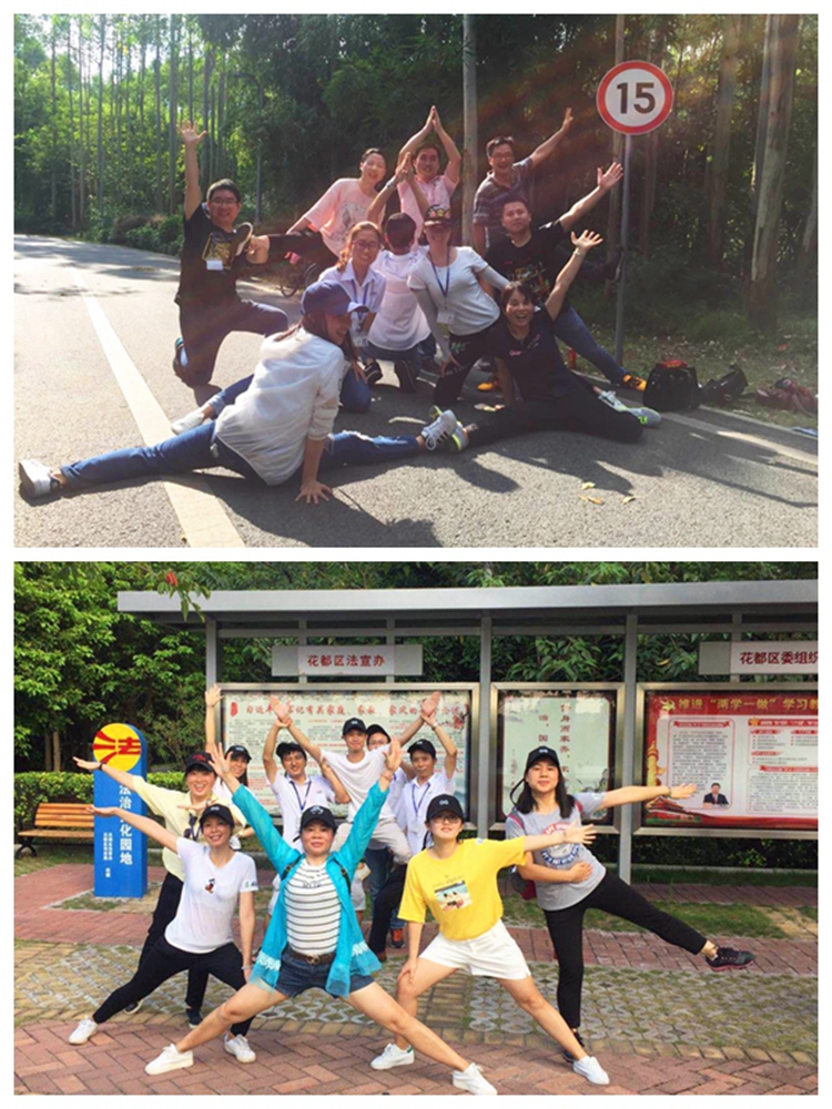 發現暗號對接人之后,組員們拿到的任務卡是要在指定地點完成線索圖紙上的舞蹈組合動作,拍照發送至指定會務組人員即完成任務,若圖片背景中有指定元素則可獲得加分。為了讓團隊拿到更高積分,各組成員又在風景區里飛奔起來前往目標地點,并火眼金睛得尋找著可以加分的背景元素。到達拍攝地點之后,平時坐在辦公室里的電池人,奮力模仿著圖紙上的舞蹈動作,有需要做一字馬的、有需要做高踢腿的、有需要仰首挺胸跳起的等等一系列高難度專業動作,略顯笨拙但又可愛的國光人們啊,在組織拍照時把一旁的其他隊員以及風景區里的行人朋友們逗得捧腹大笑,就在比對動作的組員們更是被高難度舞蹈動作折磨得筋骨酸痛但哈哈大笑。