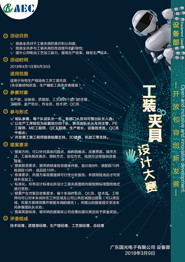 3月7日,由國光電子設備部主辦,工藝部協辦的首屆工裝夾具設計大賽于正式啟動。國光電子鼓勵創新,本次活動目的在于集思廣益,全員參與優化所有生產現場各工序工裝夾具(含設備結構改造、生產輔助工具類改善提案),從而提高全員對于工裝夾具的意識和認知度,提高全員參與工裝夾具的改造提升的積極性,全面提升公司的制程能力和工裝化水平,提高生產效率,降低生產成本。