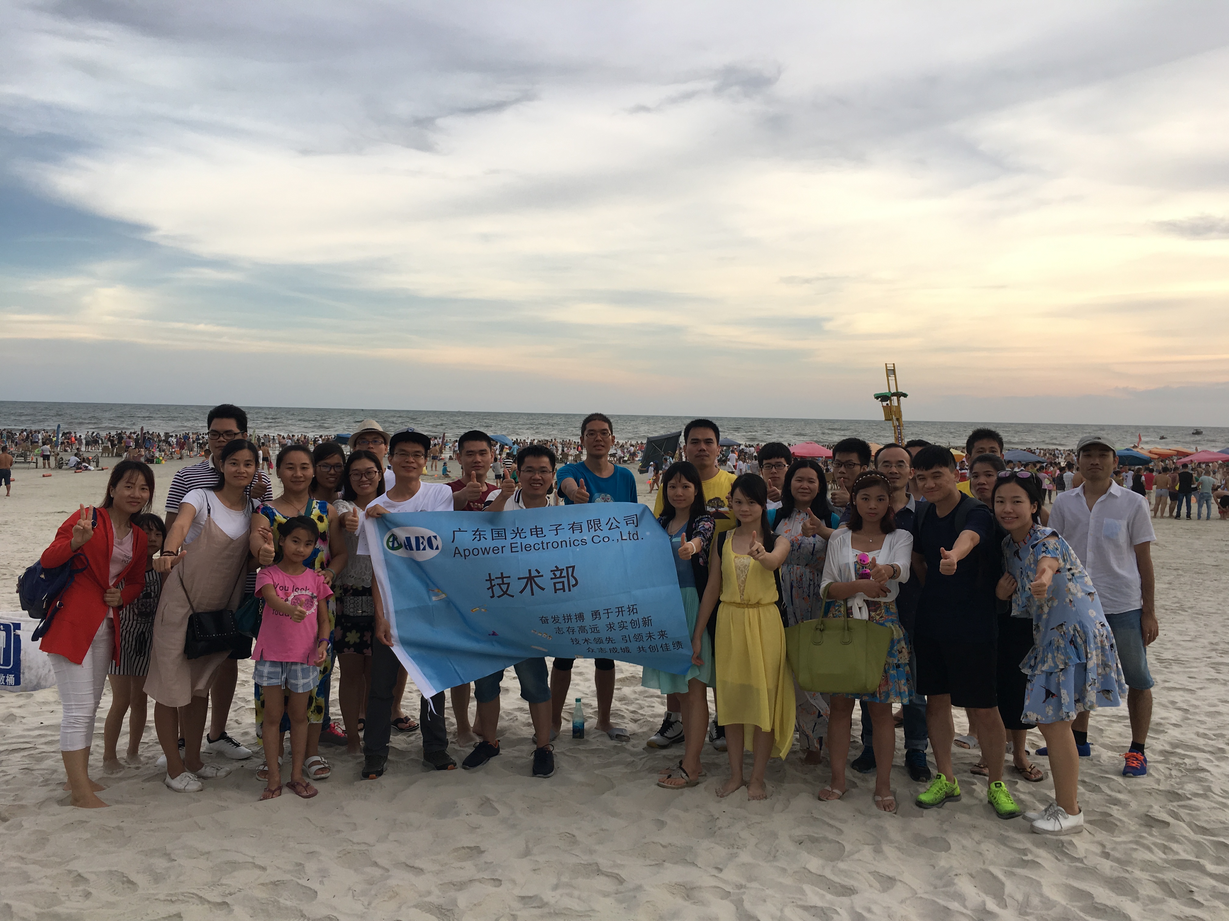 國光電子技術部本次年度旅游選擇了為期3天的湛江-北海跨省游,包括家屬在內共有37位旅伴相伴而行。研發的伍工是位大孝子,陪伴著父母同行,游玩的同時不忘與二老共敘天倫。研發的王工和制樣的劉班長是兩位愛心媽媽,帶著自家小蘿莉,母親的關愛與女兒的乖巧讓人贊嘆不已。設計的羅工伉儷同行,祥哥則有“表妹”相伴,羨煞旁人。余老大帶著部門旗幟每到一處都要向獵鷹一樣環視四方,敏銳搜尋最佳合影地點。而我則帶著充足的狗糧。